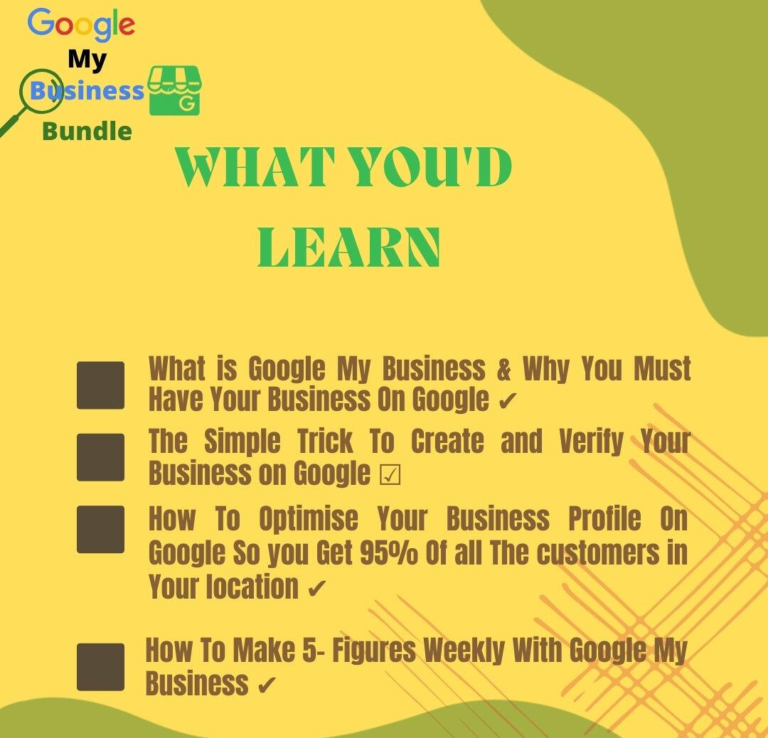 Lastly you'll get to see all the requirements and what are the purposes of each one, this is because if you don't know them or have them, it could lead to your business profile getting suspended. Video 3 - How To Rank Your Business On Google 3 Pack It's not enough to put your business on Google. In short, there are hundreds of business like yours on google already and if you don't know how to be among the top 3 in Google search and maps, putting your business on google will be a waste.In the 3rd video you learn exactly what to do to get your business ranking among the top 3 business out of thousands of similar businesses like yours in your state or region. Video 4 - How To Make 5-Figures Weekly With GMB In the 4th video you'll be discovering two little known ways to make money with Google My Business and how you can tap this formula to make up to ₦ 50,000 weekly without leaving the comfort of your house.Even if you have your own business, this two formula could be used to being in lots of extra cash that you can use to solve other pressing issues.
